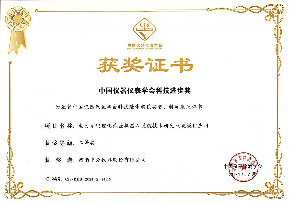 近日,我公司參與的《電力系統(tǒng)理化試驗(yàn)機(jī)器人關(guān)鍵技術(shù)研究及規(guī)模化應(yīng)用》榮獲中國(guó)儀器儀表學(xué)會(huì)2024年科技進(jìn)步二等獎(jiǎng)。