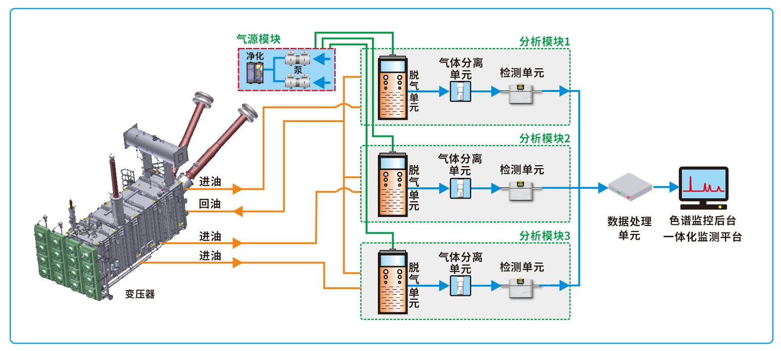 整套系統(tǒng)采用冗余模塊化設(shè)計(jì),每套油樣采集與油氣分離檢測(cè)單元相互獨(dú)立工作,互不干擾,分別輸出乙炔檢測(cè)數(shù)據(jù),一套檢測(cè)單元工作異常或退出時(shí)不影響其它模塊的運(yùn)行。